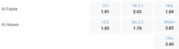 Như nhận định ở trên, Al Fayha được đánh giá mạnh hơn nhưng phong độ lại không tốt bằng Al Fayha (thắng 1, hòa 1, thua 3 trong 5 vòng gần nhất so với thắng 2, hòa 1, thua 2). Thành tích đối đầu của 2 đội cân bằng khi mỗi đội thắng 1 trận trong 3 lần gặp nhau gần nhất, từ các con số thống kê này thì khả năng trận đấu giữa 2 đội sẽ có tỉ số hòa. Với tỉ lệ kèo Al Fayha chấp 1/2 trái thì nên đặt cửa cho Al Hazem.
