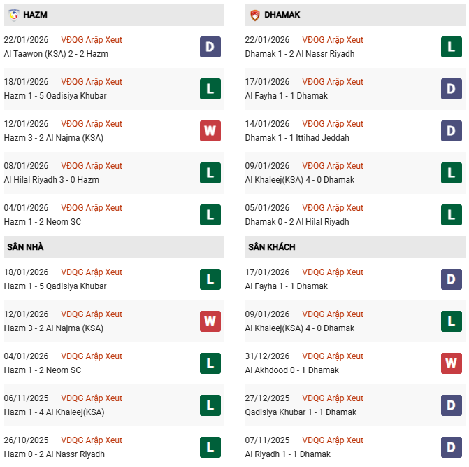 Năm trong số 6 trận sân khách gần đây thuộc giải VĐQG Saudi Arabia của Damac không xuất hiện nhiều hơn 2 bàn thắng. Kịch bản tương đối quen thuộc này dự kiến tái diễn khi Damac cùng Al Hazem thi đấu vòng 18 mùa 2025/26.