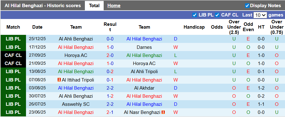 Thống kê cho thấy, Al Hilal Benghazi đã toàn thắng 2 trận sân nhà gần nhất. Nếu mở rộng ra 20 trận gần đây, họ thắng tới 14 trận,. Đáng chú ý, Al Hilal Benghazi ghi trung bình 1,8 bàn/trận tại tổ ấm của mình, con số cho thấy khả năng tận dụng lợi thế sân bãi cực tốt.