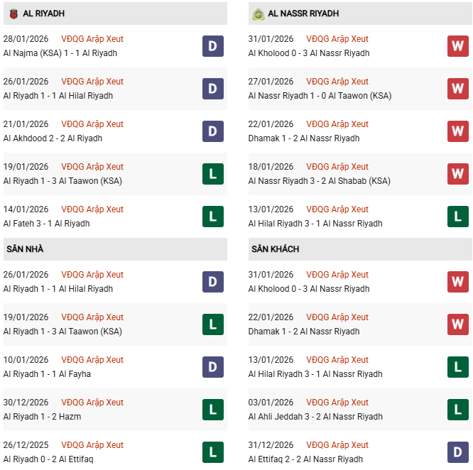- Al Riyadh hòa 1, thua 5 trong 6 trận gặp Al Nassr gần đây.