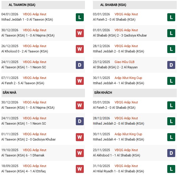 Thống kê phong độ Al Taawon vs Al Shabab: