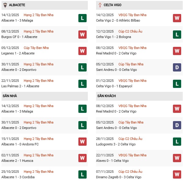 Thống kê đối đầu Albacete vs Celta Vigo: