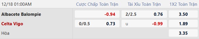 Nhận định kèo Albacete vs Celta Vigo, 01h00 ngày 18/12, vòng 1/16 Cúp Nhà Vua. Thành tích đối đầu áp đảo trong khoảng thời gian gần đây giúp Celta Vigo có thêm tự tin gieo sầu cho chủ nhà.