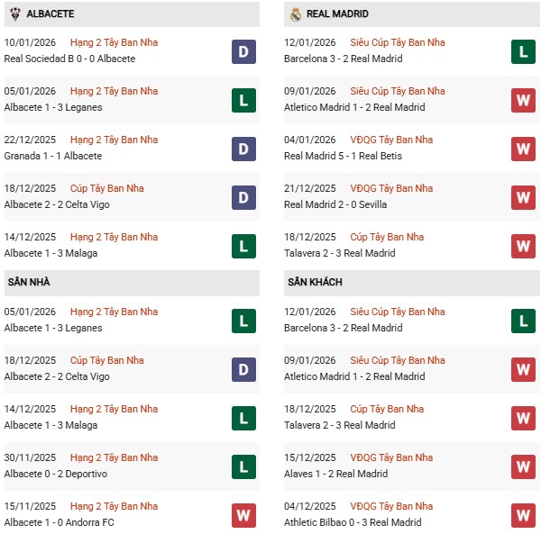 Trên sân nhà Carlos Belmonte, Albacete thắng 2 và thua 3 trong 5 trận gần nhất. Những thất bại 1-3 trước Leganes hay Malaga cho thấy khi đối thủ có khả năng kiểm soát thế trận tốt, Albacete thường nhanh chóng bị đẩy vào thế phòng ngự bị động. Dù từng tạo bất ngờ khi loại Celta Vigo tại Copa del Rey sau loạt luân lưu, nhưng đó là trận đấu mang tính khoảnh khắc, khó trở thành chuẩn mực trước một đối thủ vượt trội toàn diện như Real Madrid.