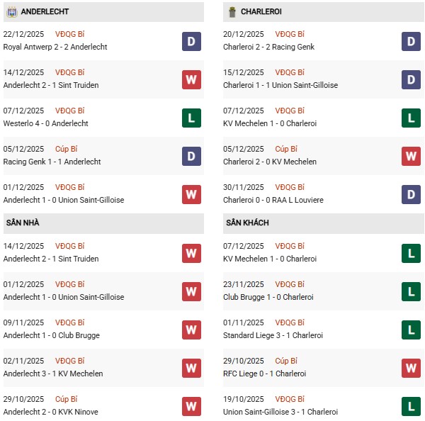 Thống kê đối đầu Anderlecht vs Charleroi: