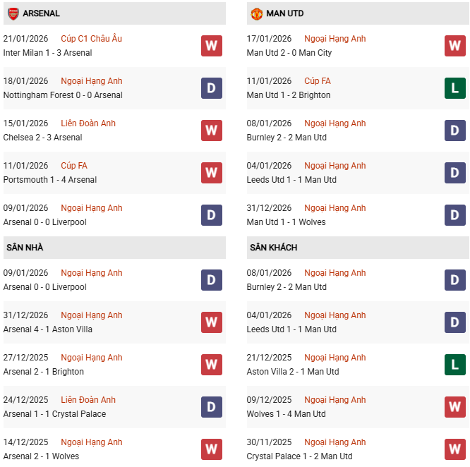 - Arsenal thắng 6 thua 2 và hòa 2 trong 10 lần gần nhất gặp quỷ đỏ.