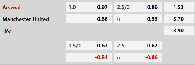 Lịch sử đối đầu trong 5 trận gần nhất đang nghiêng hẳn về phía đội bóng thành London. Arsenal đã giành chiến thắng 4/5 lần chạm trán gần đây giữa hai đội (thắng 4, thua 1). Trong trận lượt đi mùa này ngay tại Old Trafford, Arsenal cũng đã nhẹ nhàng vượt qua đối thủ với tỷ số 1-0. Với lợi thế sân nhà cùng sự ổn định vượt trội, việc chấp 1.0 trái không phải là rào cản quá lớn đối với Arsenal.