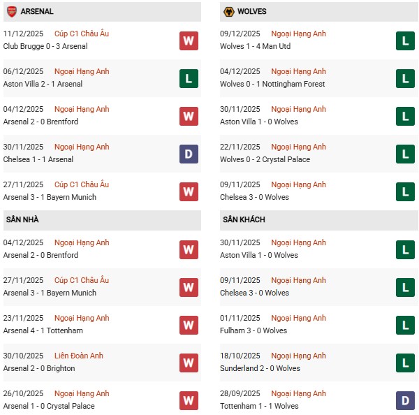 Dù để thua Aston Villa 1-2 ở vòng đấu gần nhất, Arsenal vẫn cho thấy khả năng kiểm soát thế trận tương đối tốt với 53% thời lượng cầm bóng cùng 15 pha dứt điểm, 9 trong số đó đi trúng khung thành. Vấn đề lớn nhất với “Pháo thủ” lúc này nằm ở khâu phòng ngự, khi họ đã để thủng lưới ở 5/6 trận gần nhất. Tuy vậy, tại Emirates, Arsenal vẫn duy trì được sự ổn định đáng kể với chuỗi 8 trận bất bại liên tiếp ở Ngoại hạng Anh, một điểm tựa rất lớn trong cuộc tiếp đón Wolves.