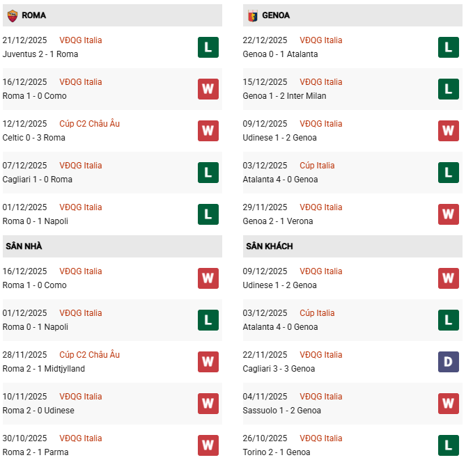 - Roma thắng 7/10 trận đối đầu vừa qua trước Genoa.