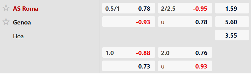 Tỷ lệ trận đấu: AS Roma thắng 2/3 trận vừa qua theo tỷ số châu Á. Về phần mình, Genoa chỉ thắng 1/4 trận gần đây.