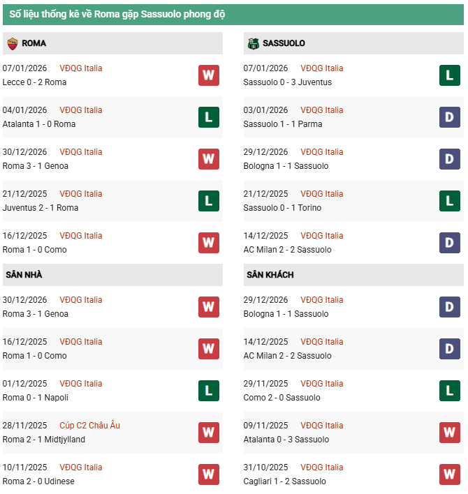 Sassuolo: Đang rơi vào khủng hoảng phong độ trầm trọng. Hình ảnh cho thấy họ vừa thua đậm 0-3 trước Juventus (07/01/2026) và không thắng trong 5 trận gần nhất (thua 2, hòa 3). Hàng công của Sassuolo đang gặp bế tắc khi tịt ngòi trong 2 trận liên tiếp gần đây.