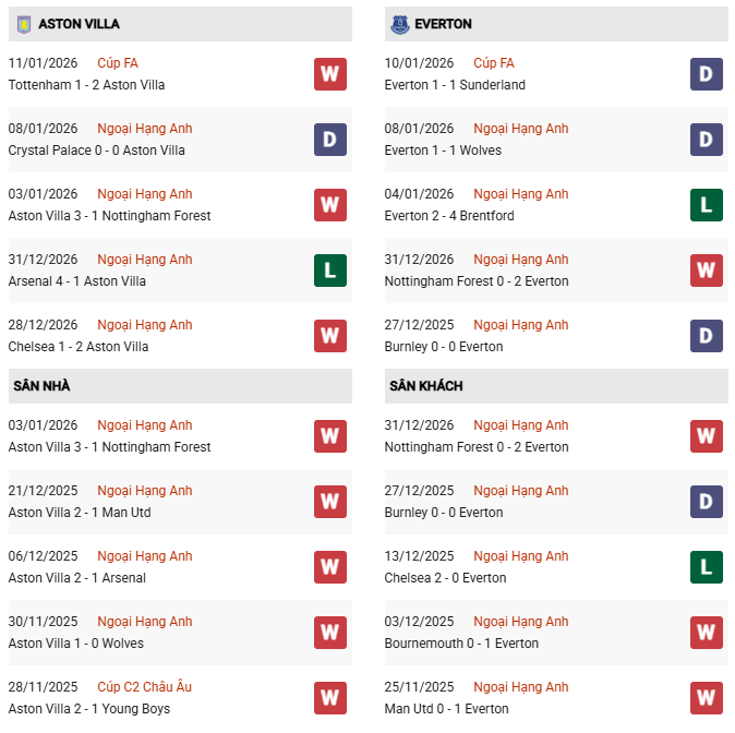 Trên sân khách, Everton cũng không có thành tích quá thuyết phục khi không thắng Aston Villa trong 6 lần làm khách gần nhất tại Ngoại hạng Anh. Dù vậy, họ vẫn có điểm tích cực khi bất bại ở 2 chuyến hành quân gần đây, cho thấy khả năng phòng ngự và tổ chức lối chơi vẫn tương đối ổn định.