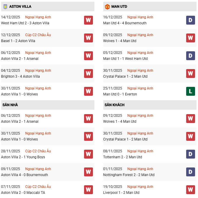 Thống kê đối đầu Aston Villa vs Manchester United: