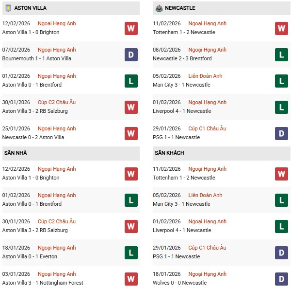 Lịch sử đối đầu gần đây: Trong 3 lần chạm trán gần nhất trên mọi đấu trường, Villa bất bại với 2 chiến thắng và 1 trận hòa. Gần nhất vào tháng 1/2026, Villa đã đánh bại "Chích chòe" 2-0 ngay tại St. James' Park.