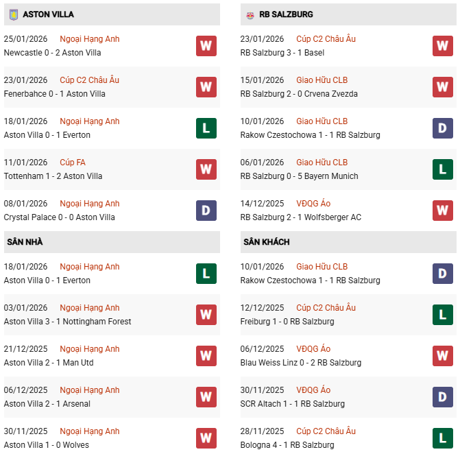 Thống kê đối đầu Aston Villa vs Salzburg: