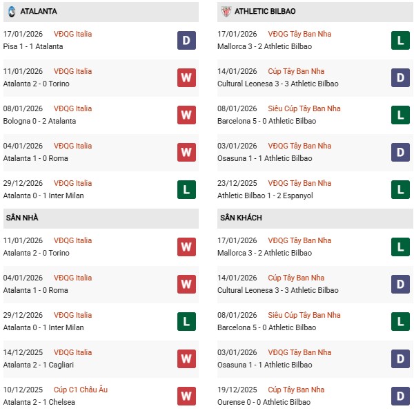 Thống kê phong độ Atalanta vs Athletic Bilbao: