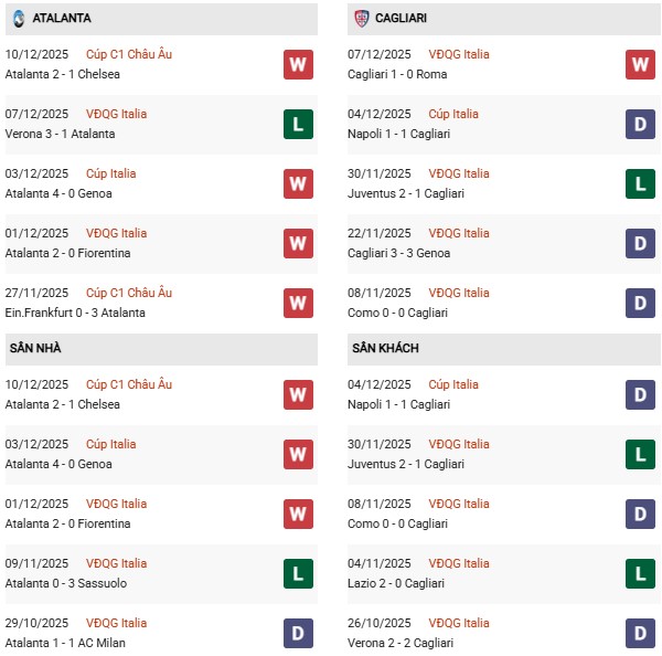 Atalanta đang thể hiện hình ảnh của một tập thể kỷ luật, kiểm soát tốt trận đấu và duy trì hiệu suất ghi bàn khá ấn tượng. Mặc dù phong độ gần đây chưa thực sự ổn định, khi trong 5 trận gần nhất họ chỉ có 1 chiến thắng và nhận tới 4 thất bại, nhưng những trận thua đó chủ yếu đến từ việc đối đầu với các đội bóng mạnh hơn. Lối chơi tấn công tốc độ, pressing tầm cao và khả năng tạo đột biến vẫn là điểm mạnh của Atalanta – điều mà Cagliari sẽ gặp rất nhiều khó khăn khi đối đầu.