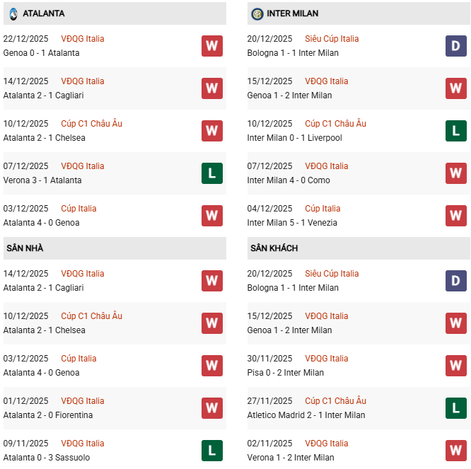 - 10 trận đối đầu gần nhất giữa 2 đội, Atalanta hòa 2, thua 8 trước Inter.