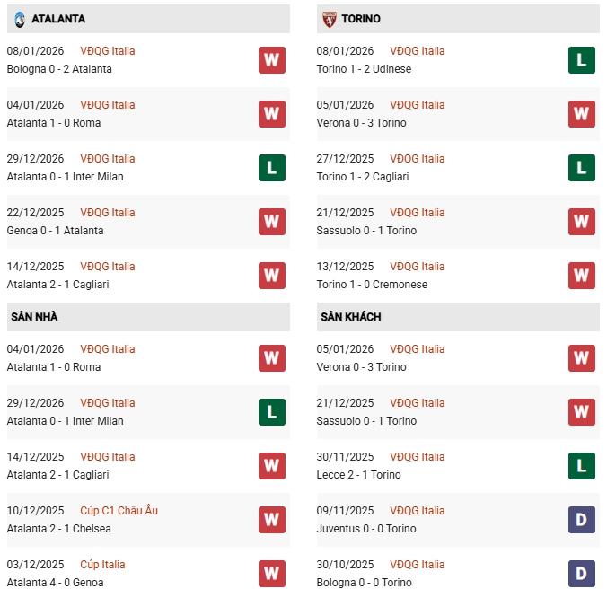 - Atalanta thắng 5 thua 2 và hòa 3 trong 10 lần gần nhất gặp Torino