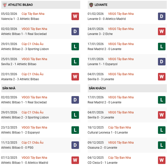 Lịch sử đối đầu: Trong 5 lần chạm trán gần nhất, Bilbao bất bại với 3 thắng và 2 hòa. Ở trận lượt đi mùa này (tháng 11/2025), họ đã đánh bại Levante 2-0 ngay trên sân khách.