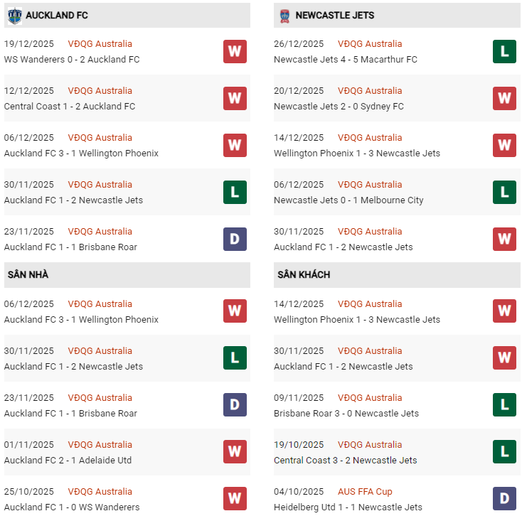 Thống kê phong độ Auckland vs Newcastle Jets: