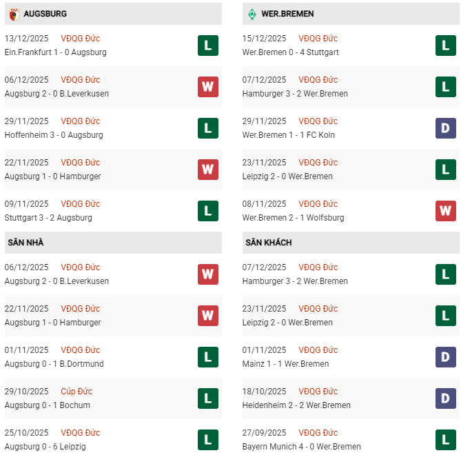 - 10 trận đối đầu gần đây, Augsburg thắng 5 thua 4 và hòa 1 trước Werder Bremen.