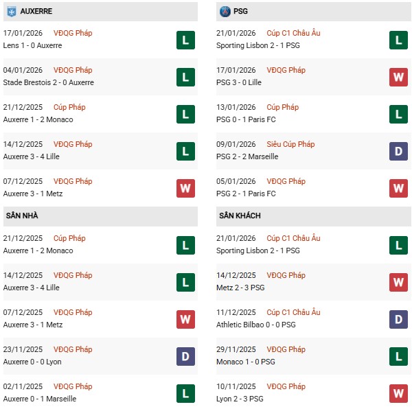 Thống kê phong độ Auxerre vs PSG: