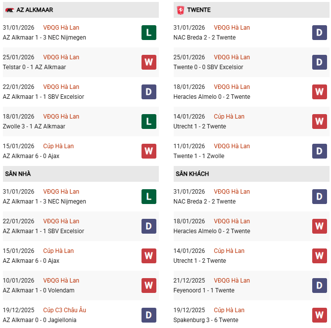 Trên bảng xếp hạng Eredivisie mùa 2025/26, AZ Alkmaar đang đứng thứ 6 với 32 điểm sau 21 vòng đấu. Đội chủ nhà ghi được 36 bàn nhưng cũng để thủng lưới tới 35 bàn, cho thấy lối chơi thiên về tấn công nhưng hàng thủ chưa thực sự chắc chắn. Phong độ gần đây của AZ không quá ổn định, xen kẽ giữa những chiến thắng và các trận thua, đặc biệt là khả năng phòng ngự khi gặp các đội có tổ chức tốt.