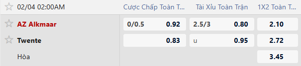 TLCA đưa ra mức AZ Alkmaar chấp 0.25 bàn cho cả trận. Đây là mức kèo thể hiện sự đánh giá AZ Alkmaar chỉ nhỉnh hơn Twente ở mức tối thiểu, chủ yếu nhờ lợi thế sân bãi. Với sự cân bằng hiện tại giữa hai đội, AZ Alkmaar dù có khả năng tạo sức ép tốt nhưng không dễ để thắng cách biệt. Twente thường chơi rất kỷ luật khi bị đánh giá thấp hơn và sẵn sàng đá thấp, chờ cơ hội phản công. Trong bối cảnh đó, kèo AZ Alkmaar -0.25 tiềm ẩn nhiều rủi ro, đặc biệt nếu trận đấu kéo dài trong thế giằng co.