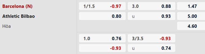 Hiệp 1 trầm lắng: 5 trận gần nhất của Barca và 5/6 trận gần đây của Bilbao đều chỉ có tối đa 1 bàn thắng xuất hiện trong hiệp 1.