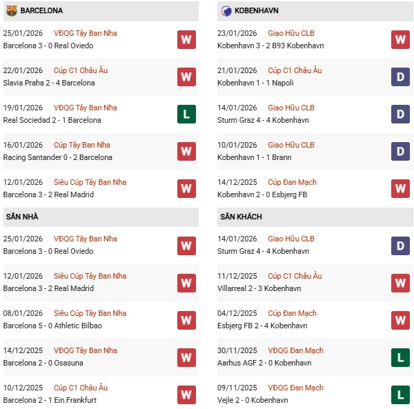 Theo bảng xếp hạng, Barcelona hiện đứng thứ 9 với 13 điểm sau 7 trận, trong khi Copenhagen chỉ xếp thứ 26 với vỏn vẹn 8 điểm. Khoảng cách lớn về vị trí cũng như phong độ phản ánh rõ sự khác biệt giữa hai đội.
