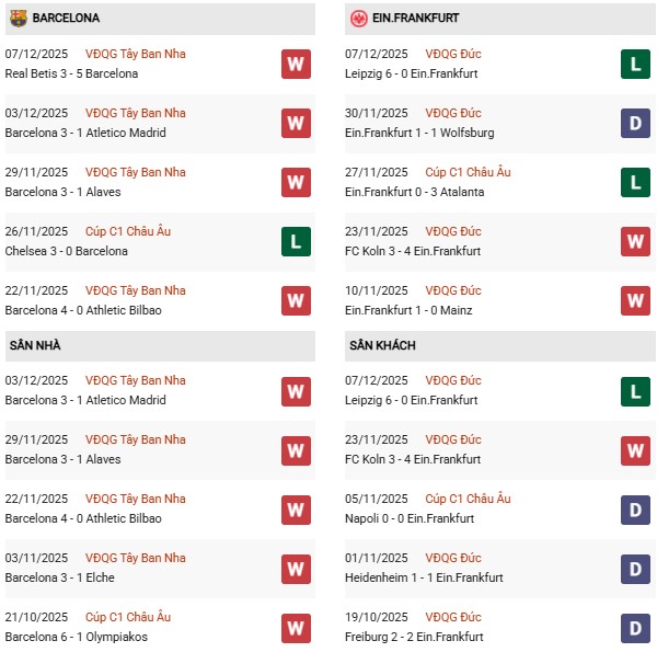 Thống kê phong độ Barcelona vs Eintracht Frankfurt: