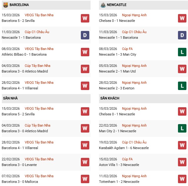 Barcelona đang thể hiện phong độ rất thuyết phục, đặc biệt là trên sân nhà. Chuỗi trận toàn thắng gần đây cho thấy đội bóng xứ Catalan đang đạt trạng thái phong độ cao và có khả năng áp đặt thế trận trước hầu hết đối thủ. Trong khi đó, Newcastle dù có những thời điểm chơi bùng nổ nhưng sự ổn định vẫn là vấn đề lớn. Thành tích sân khách của đại diện nước Anh cũng không quá nổi bật khi họ vẫn thường gặp khó khăn trước các đội bóng lớn.