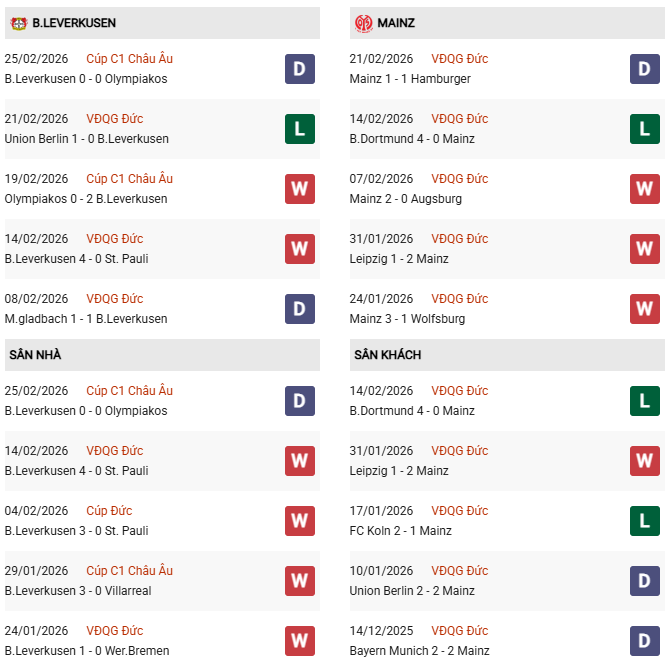 Thống kê phong độ Bayer Leverkusen vs Mainz: