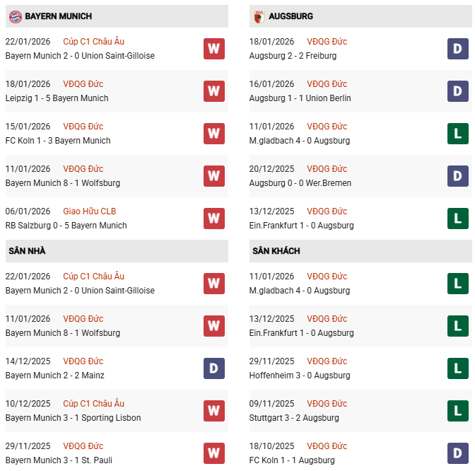 Thống kê phong độ Bayern Munich vs Augsburg:
