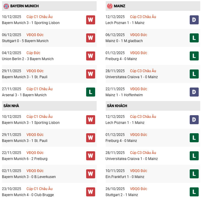 6 lần đối đầu gần nhất giữa hai đội chứng kiến Bayern thắng 4 và Mainz thắng 2, không có trận hòa. Đáng chú ý, những trận đấu giữa hai đội luôn diễn ra cực kỳ bùng nổ với trung bình 4,5 bàn thắng mỗi trận. Điều này phần nào cho thấy lối chơi cởi mở của cả hai, nhưng cũng phản ánh sự vượt trội của Bayern trong khả năng tạo đột biến.