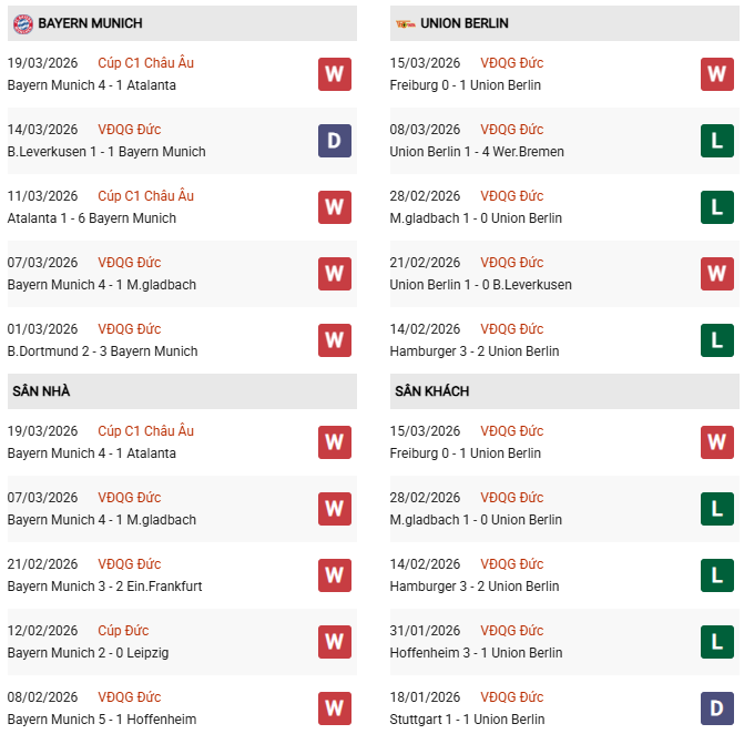Thống kê đối đầu Bayern Munich vs Union Berlin: