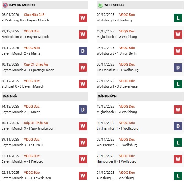 Thống kê đối đầu Bayern Munich vs Wolfsburg: