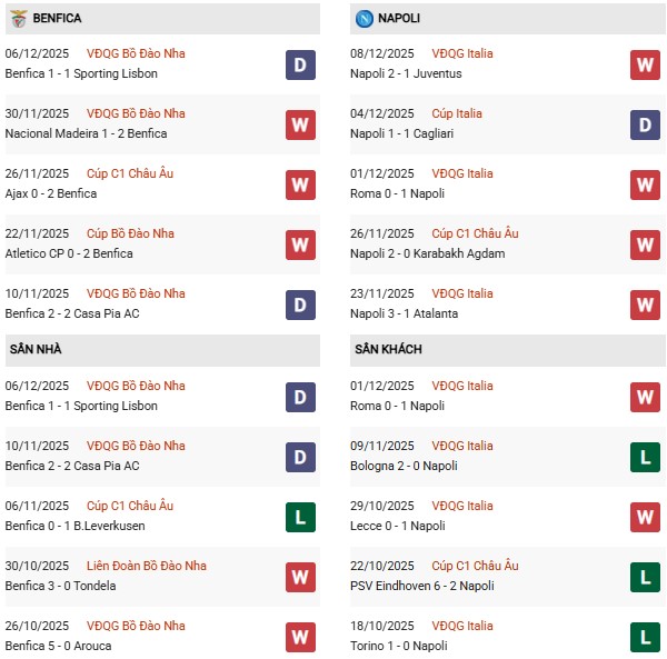 - 5 trận đối đầu gần nhất giữa 2 đội, Benfica thắng 1, thua 4 trước Napoli.