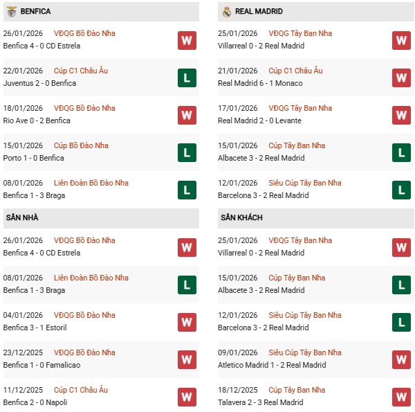 - 2 trận đối đầu gần nhất giữa 2 đội, Benfica thắng 1, hòa 1 trước Real Madrid.