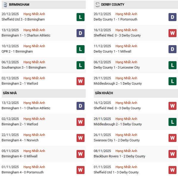 - Derby County thắng 5 thua 2 và hòa 3 trong 10 lần gần nhất gặp Birmingham.