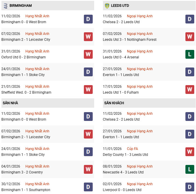- 10 trận đối đầu gần nhất giữa 2 đội, Birmingham thắng 5, thua 5 trước Leeds.