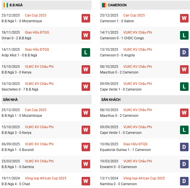 Thống kê phong độ Bờ Biển Ngà vs Cameroon: