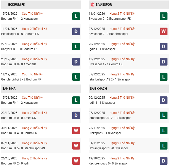 - 5 trận đối đầu gần nhất giữa 2 đội, Bodrum thắng 3, hòa 2 trước Sivasspor.
