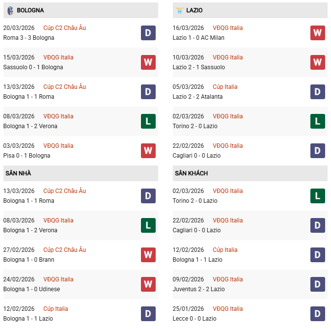 Thống kê phong độ Bologna vs Lazio: