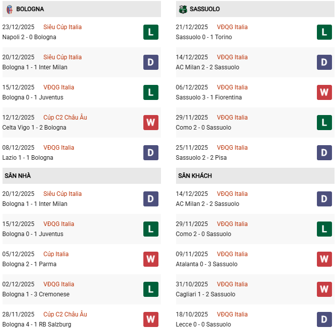 Số liệu thống kê về Bologna gặp Sassuolo: