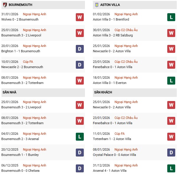 Thống kê phong độ Bournemouth vs Aston Villa: