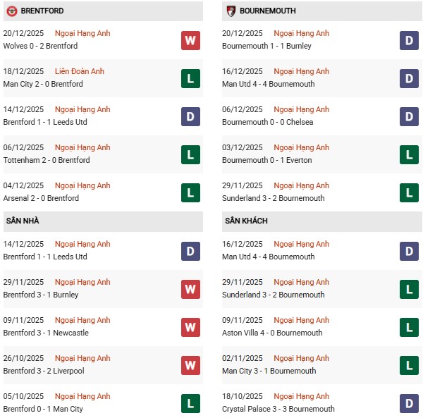 Thống kê phong độ Brentford vs Bournemouth: