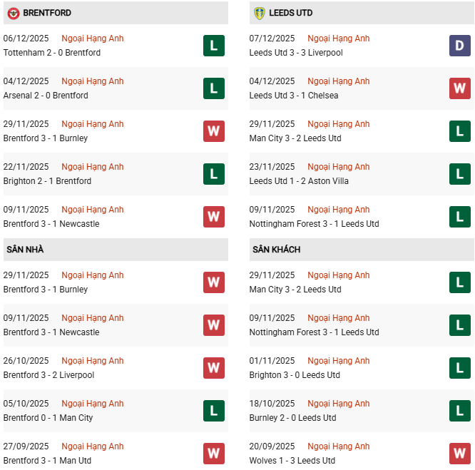 - Brentford thắng 3 thua 3 và hòa 4 trong 10 lần gần nhất đối đầu Leeds.