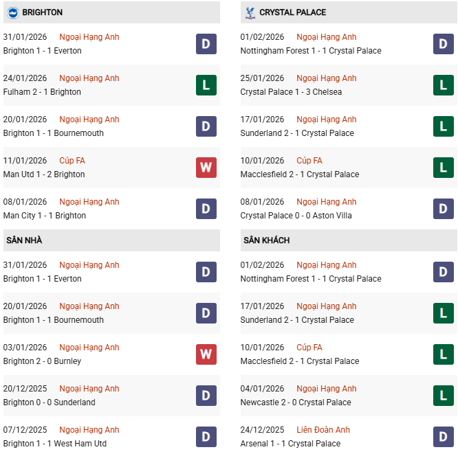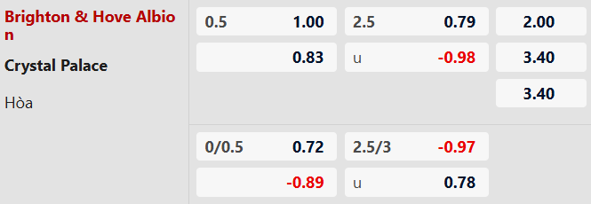 4/4 trận sân nhà gần nhất của Brighton và 4/6 trận gần đây của Palace có tổng bàn thắng dưới 2.5.